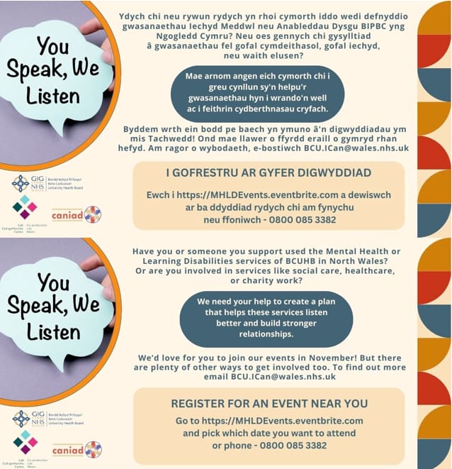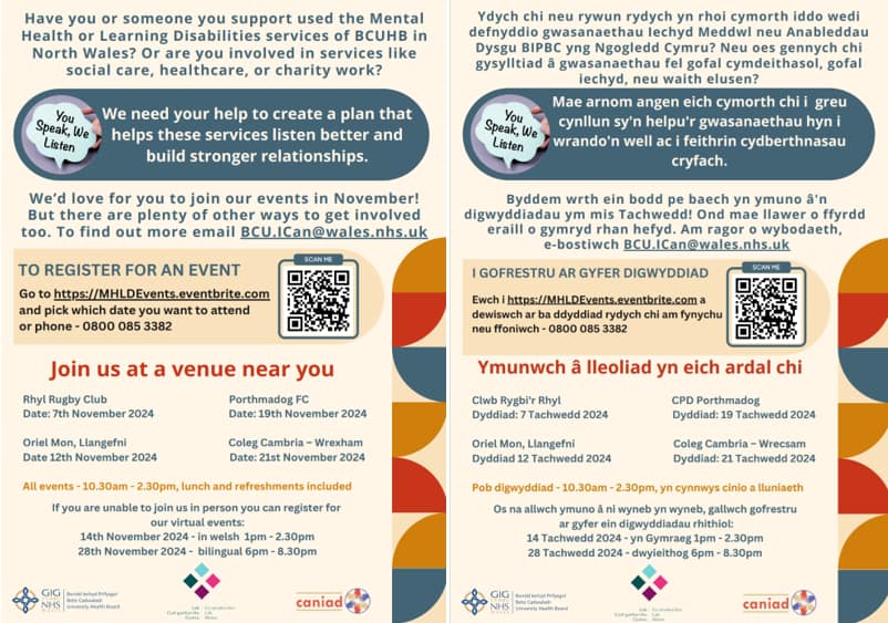 We would like to invite people with Lived Experience of Mental Health Services, Learning and disabilities, Carers/Supporters in North Wales to come along and be involved at the events to help look at: