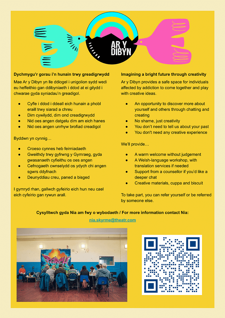 Ar y Dibyn provides a platform for individuals to connect, express themselves, and find community through the Welsh language, particularly those impacted by addiction and their loved ones. Creative workshops and support sessions are set to commence from 19/09/24 in the Maesgeirchen Youth and Community Centre in Gwynedd. To inquire further, contact niaskyrme@theatr.com.