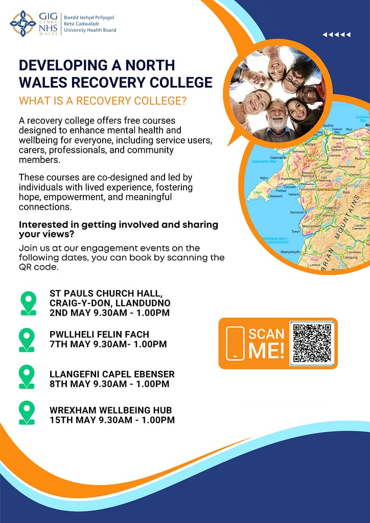 We would like to invite people with Lived Experience of Mental Health Services, Learning and disabilities, Carers/Supporters in North Wales to come along and be involved at the events to help look at: